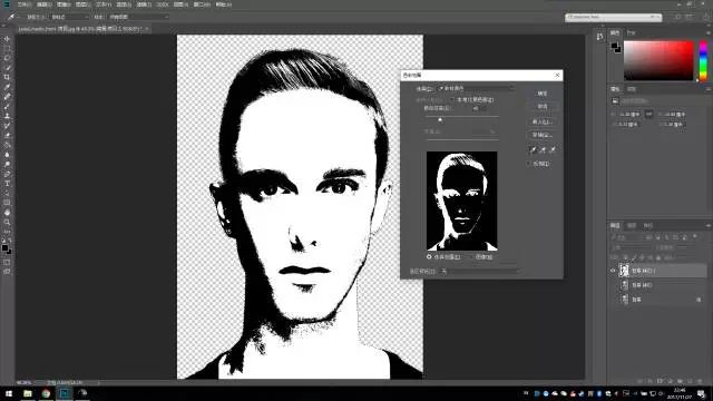 接着,菜单栏-选择-色彩范围。进入色彩范围工具后,鼠标会变成吸管工具,点一下头发黑色区域,预览变成头发白色,面部黑色,然后按确定