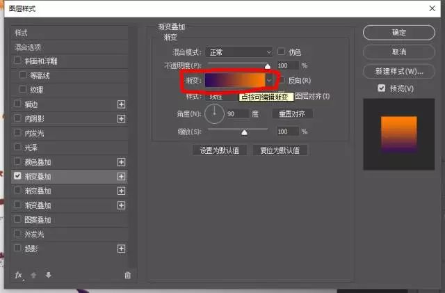 点击渐变旁边的颜色,可自定义渐变色彩,可按需要进行修改,有兴趣的同学可以自行尝试搭配, 点选确定后会得到以下效果。
