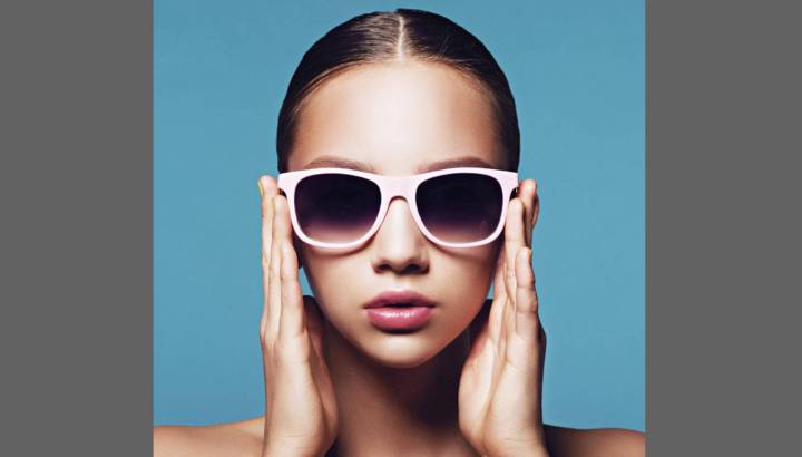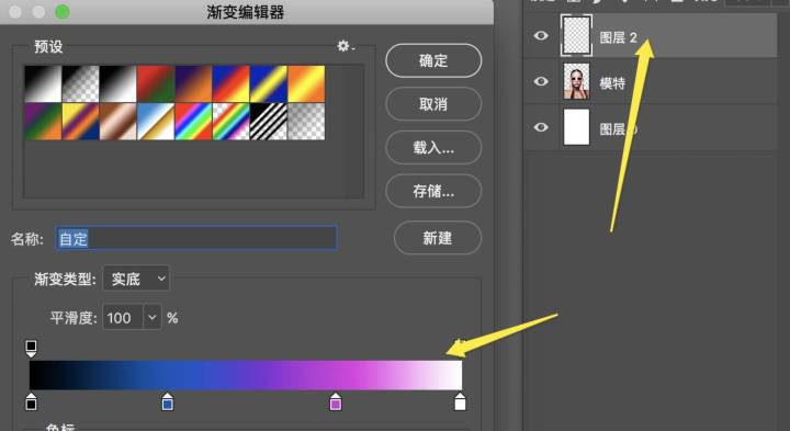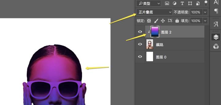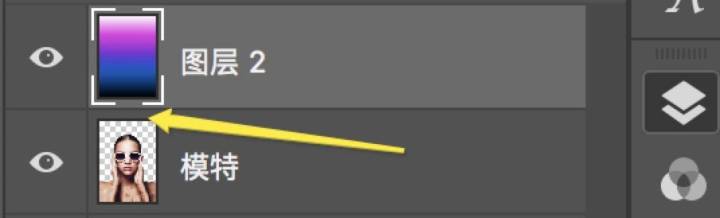 2. 渐变先要给人物进行一个整体渐变,然后针对墨镜再做一层渐变。渐变颜色的调整是最容易出效果的。在人物图层上面新建空白图层,给图层做一个渐变。选好颜色后,按出shift在画布上垂直拖动。