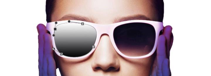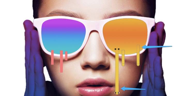 4.用钢笔工具在墨镜上绘制轮廓,调整好轮廓锚点,在形状上给出渐变色,并给渐变色,用矩形工具绘制小矩形,选中镜片的图形与矩形,按ctrl+E 合并矢量图形,整体给渐变色。