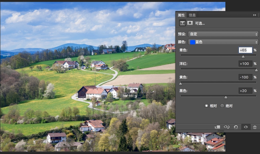 因此需要用可选颜色工具,选择天空中的蓝色,加相邻色:青、品(洋红),减互补色黄色。