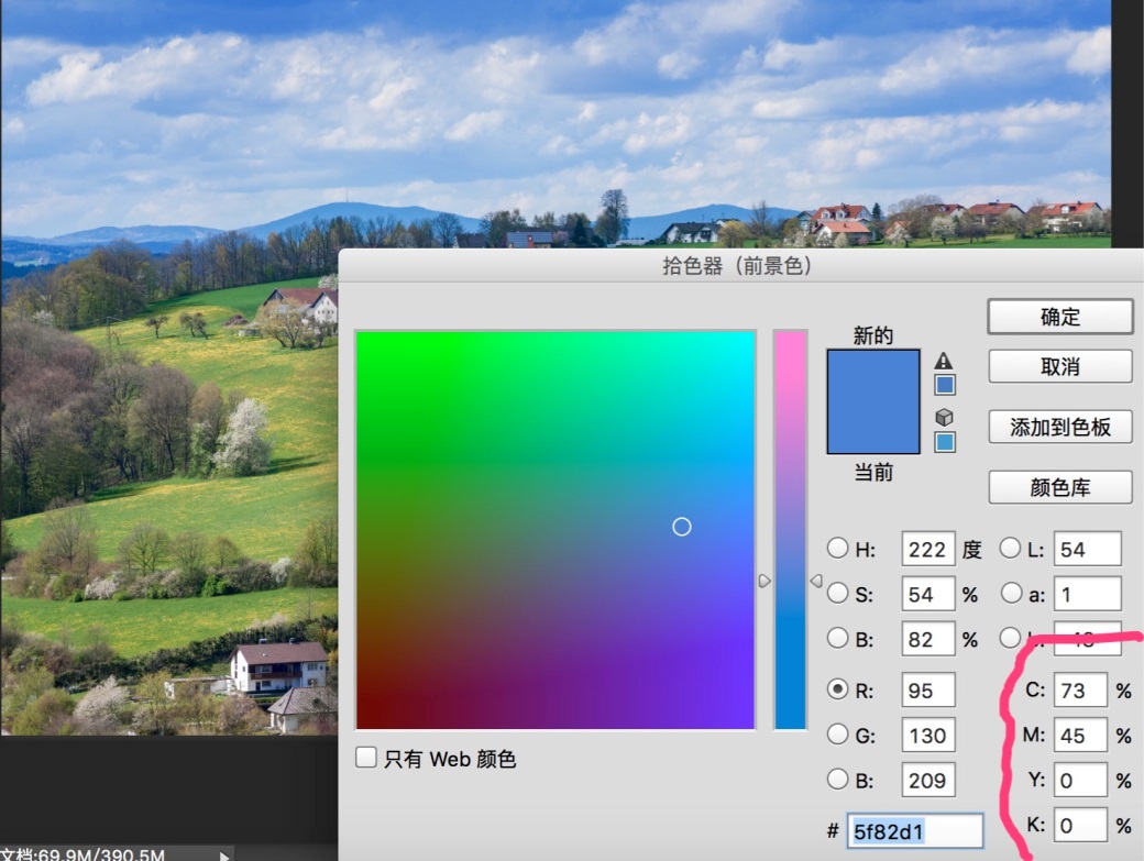 下面是一张不通透的天空实例,我在红点处取样天空的蓝色,可以看到颜色CMYK面板中显示蓝天的色彩是68%青+31%品+19%黄。