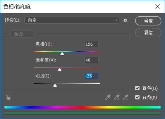 色相饱和度是ps中很常用的调色工具,我们在勾选着色后,色相滑块指向什么颜色即可将图形调整为该颜色。