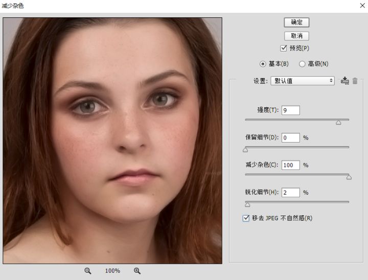 把素材图导入PS,然后复制一份,得到图层1。在图像的磨皮处理时,我们都是在复制图层上面来完成的,大家要记住保留原片,在ps上的操作会减少图像的像素点、分辨率。然后在图层1上执行滤镜>杂色>减少杂色命令。相关数值如图。(数值根据素材灵活调整。)
