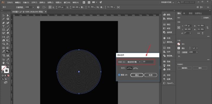 打开Ai软件,新建画板,然后画一个黑色矩形锁定充当背景。画一个描边圆。然后等比缩放1%复制出来一个圆。使用混合工具混合,步数这里调的是20。