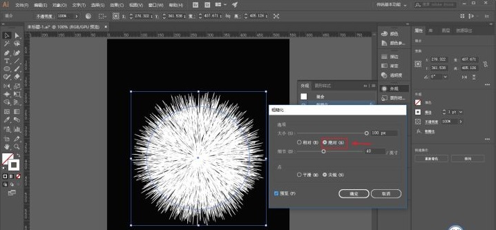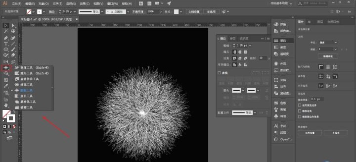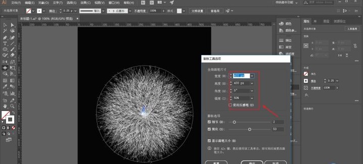 接下来选择膨胀工具,按回车键可以调出参数面板,调整画笔的大小以及强度。由于对象是圆,所以我们的画笔尽量的对准中心去点击。