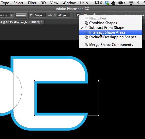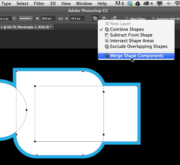 PS另一个很酷的功能是能很容易的实现将矢量图形无损地合并在一起。通常,我们用Command/Ctrl + E来合并位图,但在Photoshop CC版本中,我们可以用同样的快捷键来合并矢量图形图层,而且不用进行栅格化。当两个或两个以上的图形合并在一起之后,还可以通过路径选择工具来进行单个选择,并通过路径操作来改变图形之间相互叠加运算的方式。
