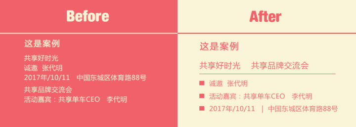 信息的归类意味着将相似的内容排列在一起,这样能使信息表达更加明确。下面是两种排版,把关键词整合到一起更能抓住人的眼球,杂乱的归类和排版则让观众难以读懂。