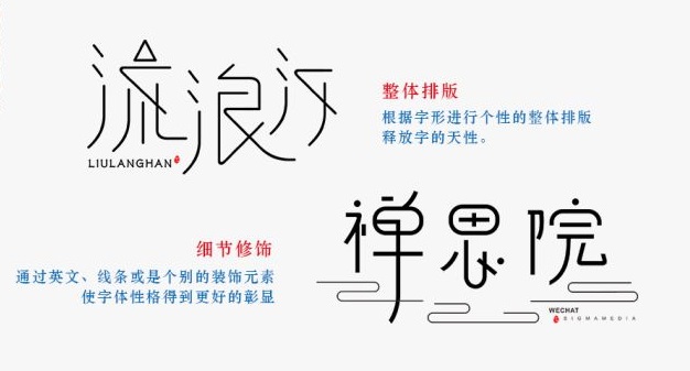 从笔体到结体,字体性格基本就已定形。其实,字体性格还可以通过排版和细节的修饰来加强。排版,单纯的横向排列或竖向排列会显得拘谨和乏味,不妨根据字形来做相应的排版,避免单调罗列造成的压抑字体性格之感。