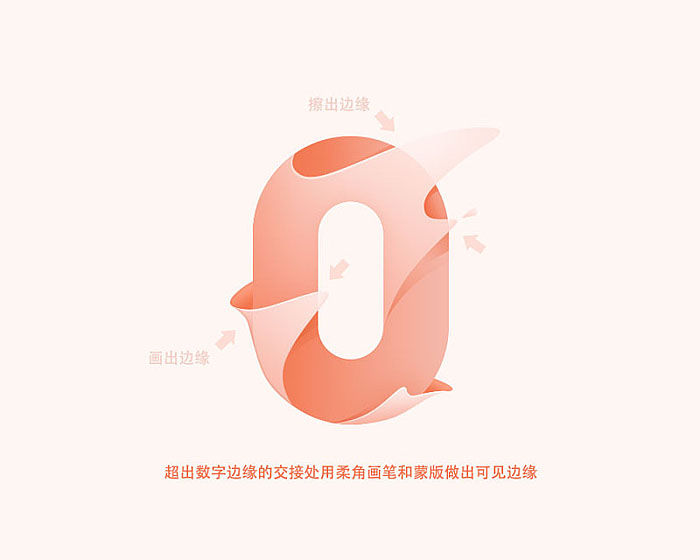 6、而液体的亮面和暗面则采用一点点深浅变化的微渐变做出质感。深浅的选择也是有原因的:液体喷上来之后,在层次上左侧贴着数字比较近,能隐约看到底下深色的数字,所以就比较深一点;而液体的右侧飘得比较高不太贴着字体,就显得浅一点。现在看起来已经有那么点意思了对吧哈哈,接下来就是让细节丰满起来。