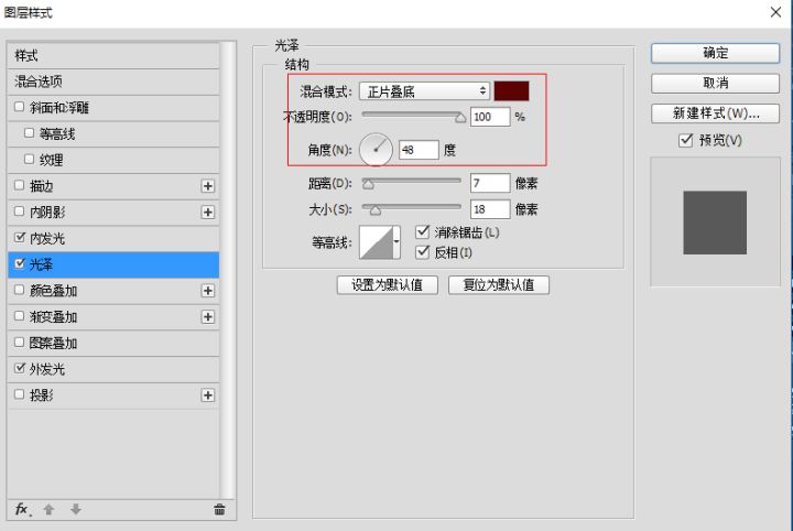 混合模式设置为正片叠底,颜色选择暗红。角度设置为48度。其他的数值可根据具体需要灵活调整。