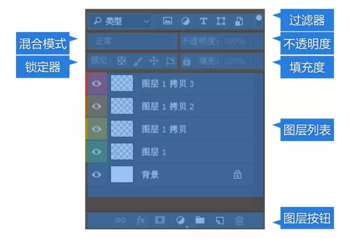 通过观察图层面板,可以发现图层面板主要由图层过滤器、混合模式、不透明度、填充度、图层锁定器、图层列表、图层按钮等这几个部分组成。下面我将依次进行介绍。