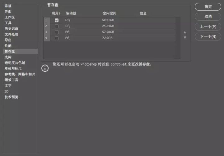 缓存的运行速度 C-D-E-F 的顺序排列,所以我修改暂存盘的位置为