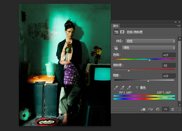 以刚才那张图片为例,我们用吸管工具选中绿色,然后新建图层,填充颜色,反相,把混合模式改为色相,调整不透明度(一般小于50%),结果是: