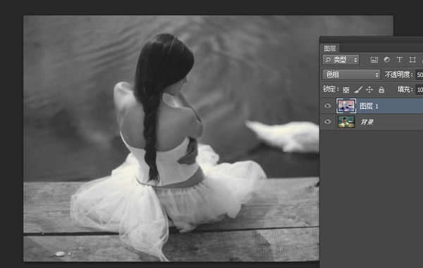 我们复制图层,反相,然后把混合模式改为色相,把不透明度调为50%之后,你会发现图片变成黑白了(极少部分色彩只会降低饱和度,不会完全变灰)。换言之,在绝大多数情况下,我们把一种颜色和它50%的反相色在色相模式下混合,会变成灰色。这就为我们后面的操作奠定了基础。