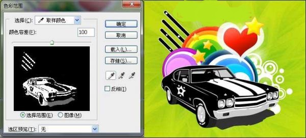 设置预览框的显示:在预览框的下面选择“选择范围”单选按钮,可预览由于对图像中的颜色进行取样而得到的选区。其中白色区域为选定的像素,黑色区域为未选定的像素,灰色区域是部分选定的像素。若选中“图像”单选按钮,可预览整个图像。
