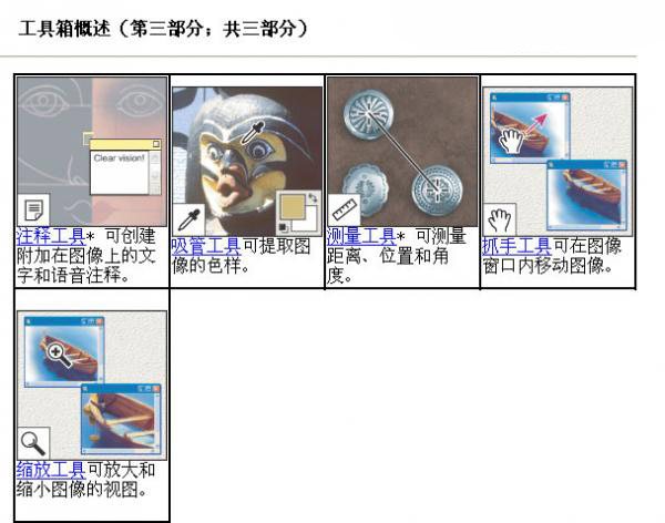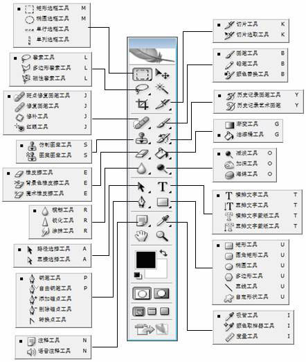 下面是photoshop的帮助文件中对各种工具的作用的概述.(各种板本的 photoshop的工具箱会略有不同)
