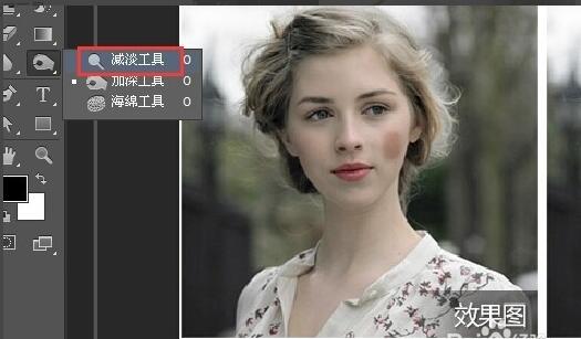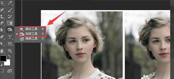 1.点按工具栏左侧的加深 减淡 海绵工具 长按鼠标会弹出菜单 点选加深工具