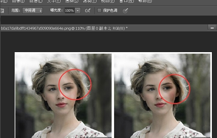 9.左边的红圈区域是勾选保护色调涂抹的效果 右边的红圈是未勾选保护色调涂抹的效果