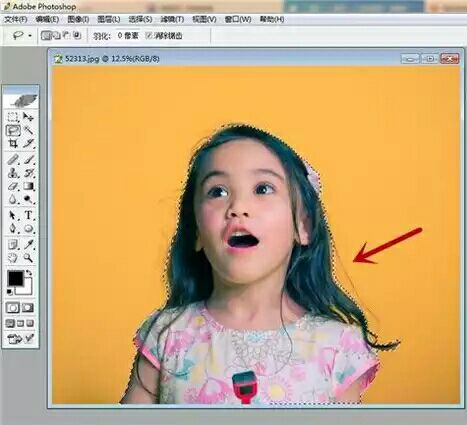 6、在黄色的区域,也就是非抠图区域点击,即可将区域选中,同样按住Shift进行增加选区,按住Alt减少选区。