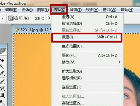 4、点击“选择”→“反选”,或者按Shift+Ctrl+I进行反选,即可将抠图多余的区域选中。