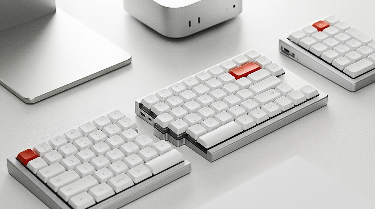 NocFree 是一款创新人工学键盘设计,其采用了模块化设计思维,一款简单的键盘可拆分组合,满足用户的使用需求。整个键盘采用苹果设计风格,整块铝合金 CNC 铣削打造,经 150 目锆石喷砂处理呈现哑光质感,极为高级。